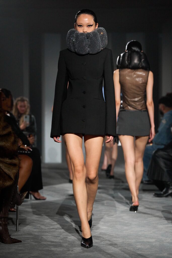 The clothes carried this duality like a pulse. Short silhouettes sliced the air with precision—micro-skirts and sculpted jackets daringly cropped, the body alternately shielded and revealed. Black, white, and the softest gray formed a palette stripped of excess, a discipline that allowed texture to assume meaning: leather shaped with urban severity, knit lace falling with improbable softness, chainmail-knit suits catching the light like modern armor. It was a language of proportion and restraint, of authority made visible in cut and seam.