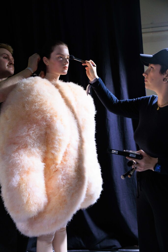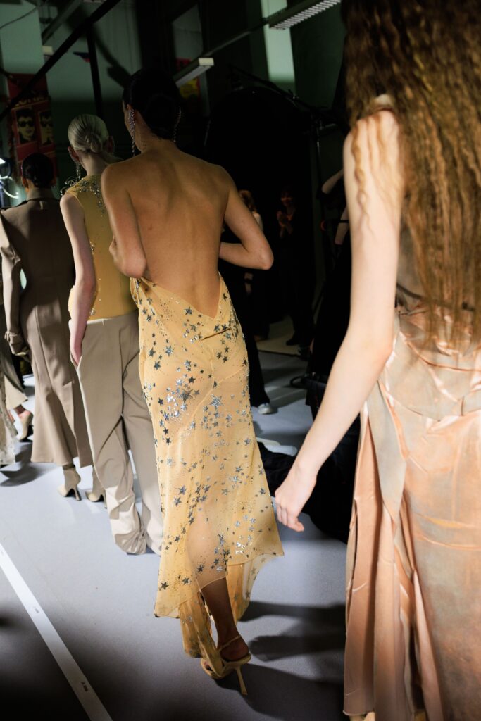 Backstage at Mugler, time folds differently. The air hums with a charged quiet — that magnetic tension that exists between art and performance, between the human and the sculptural. Models move like apparitions of strength; every gesture rehearsed yet alive with instinct. Under the glow of cold blue light, fabrics gleam like liquid armour, awaiting their transformation under the runway’s gaze.