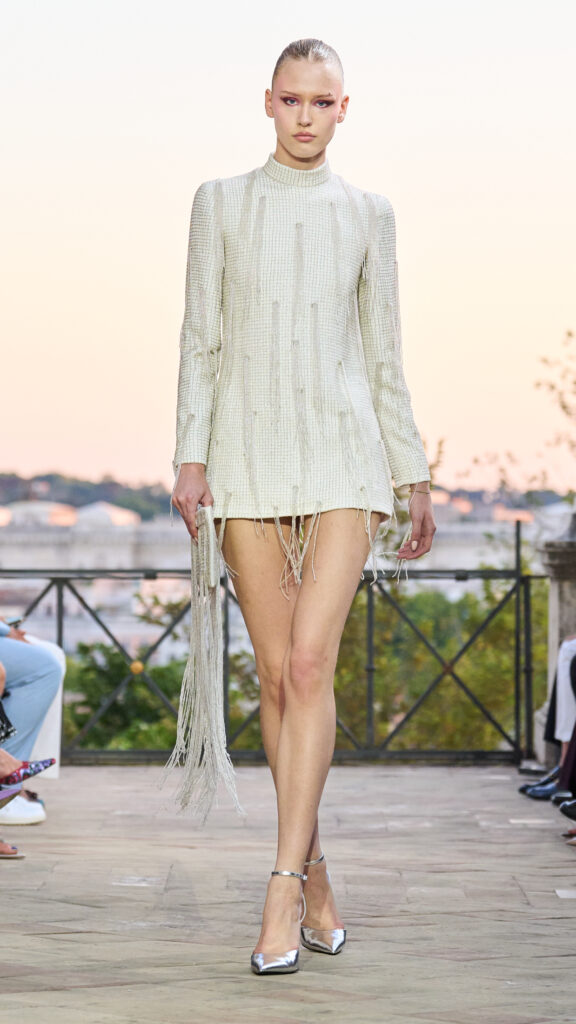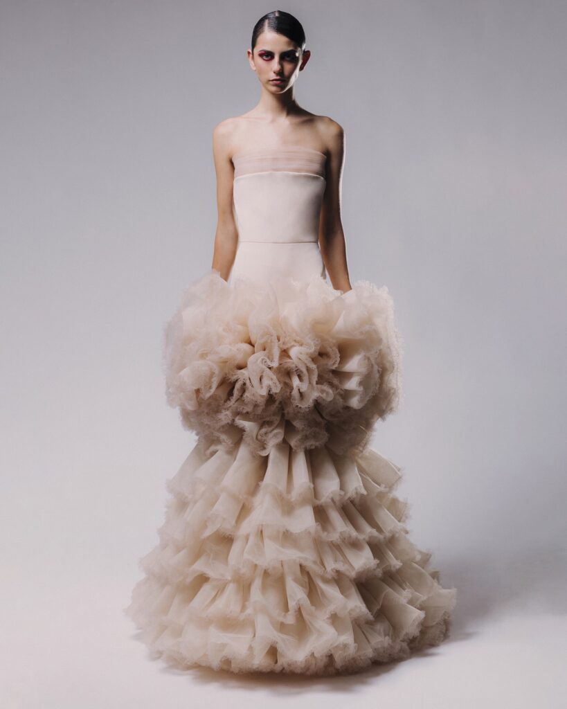 AG – The collection consists of 27 looks, alternating between flowing dresses and sculptural constructions. The shapes move and transform thanks to a continuous interplay of laser-cut ribbons that become bodices, stoles, capes, skirts and architectural details, while large volumes of tulle open up into macro ruffles and sculpted petals, also laser-cut, which shape mini dresses and overcoats. The focus is on materials: deep velvet, impalpable organza, crêpe cady, chiffon, tulle and silk cady follow one another in a tactile and visual narrative, in which each fabric accentuates the contrast between structure and lightness.