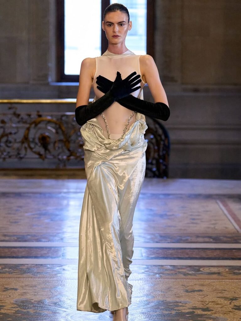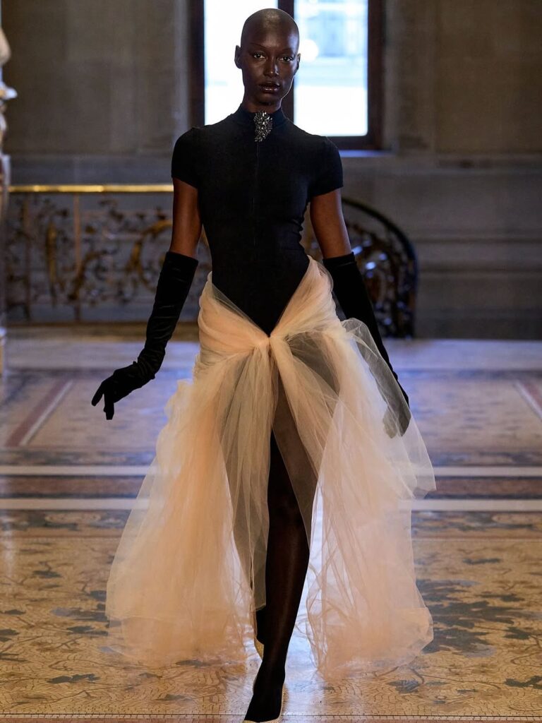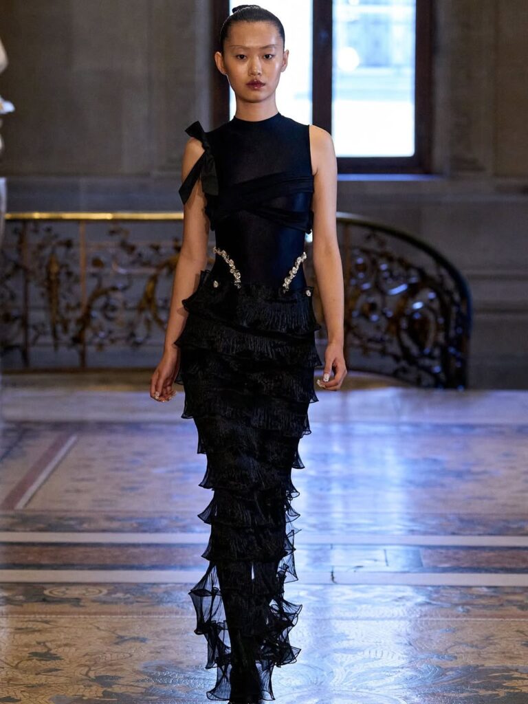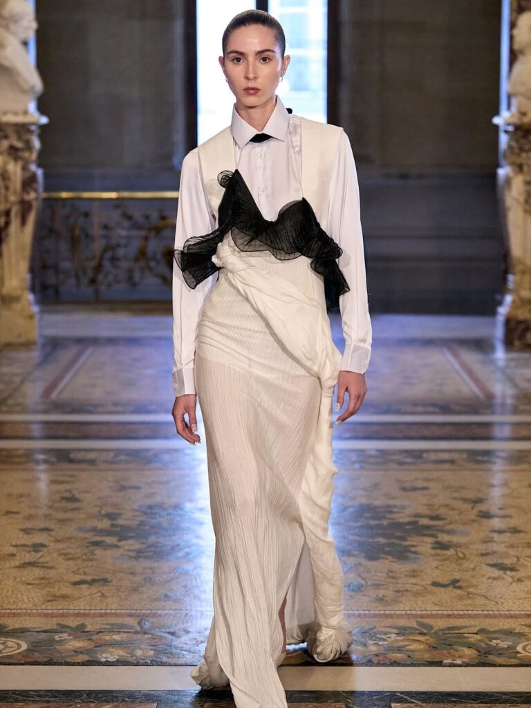 In the world of couture — a realm often obsessed with grandiose statements and ornamental excess — Dullaert practices a different language: one of meditation, sensitivity, and balance. His creations feel less like objects and more like continuations of the wearer’s breath. They appear to be sculpted from the silence between movements, from thoughts that never needed to be spoken to be understood.