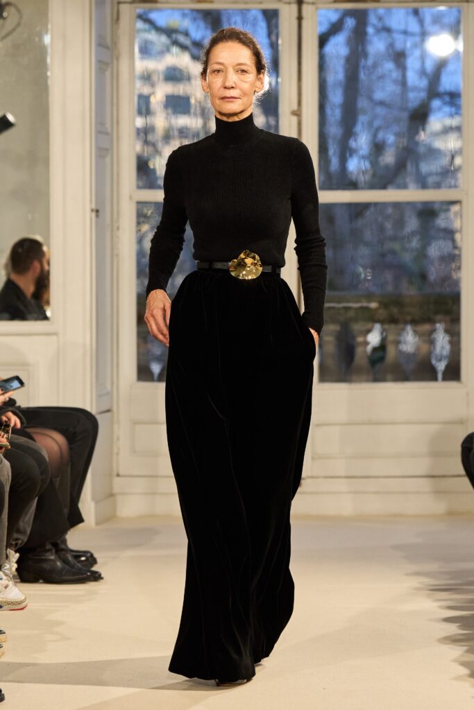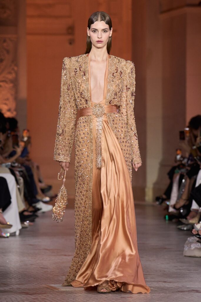 And then, there is the embroidery the living heart of the Zuhair Murad maison. Here, it reaches baroque extremes, gleaming with pearls and molten cabochons like offerings at an altar. But nothing feels heavy. The gowns breathe. They shimmer not for spectacle, but for transformation. Each stone, each thread, seems to hold a secret. The kind whispered between women across generations: that survival, too, can be beautiful.