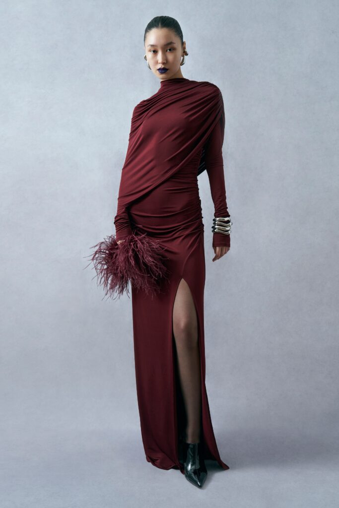 Inspired by the luminous silhouettes of the 1930s and 40s, Murad doesn’t merely reference Barbara Stanwyck and Rita Hayworth—he rewrites their mythology. The femme fatale, once scripted to fall, now takes flight. Shoulders are lifted like wings. Waists are cinched not as a symbol of containment, but of poise, purpose, and propulsion. Trains sweep behind like punctuation marks to a sentence that no longer ends in tragedy.