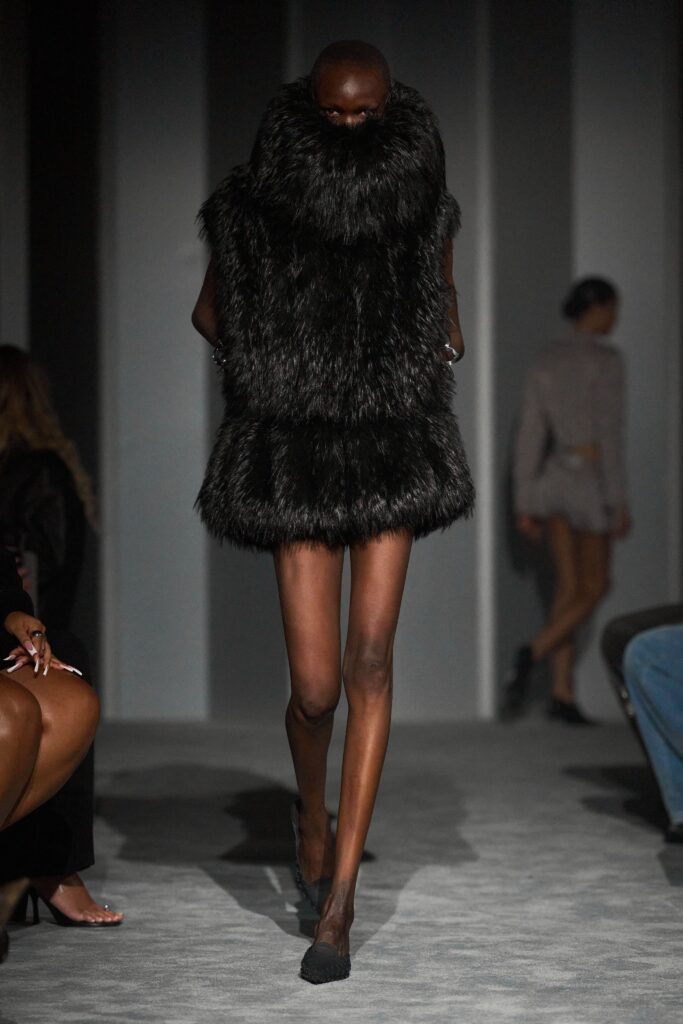 The clothes carried this duality like a pulse. Short silhouettes sliced the air with precision—micro-skirts and sculpted jackets daringly cropped, the body alternately shielded and revealed. Black, white, and the softest gray formed a palette stripped of excess, a discipline that allowed texture to assume meaning: leather shaped with urban severity, knit lace falling with improbable softness, chainmail-knit suits catching the light like modern armor. It was a language of proportion and restraint, of authority made visible in cut and seam.