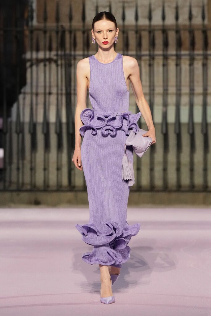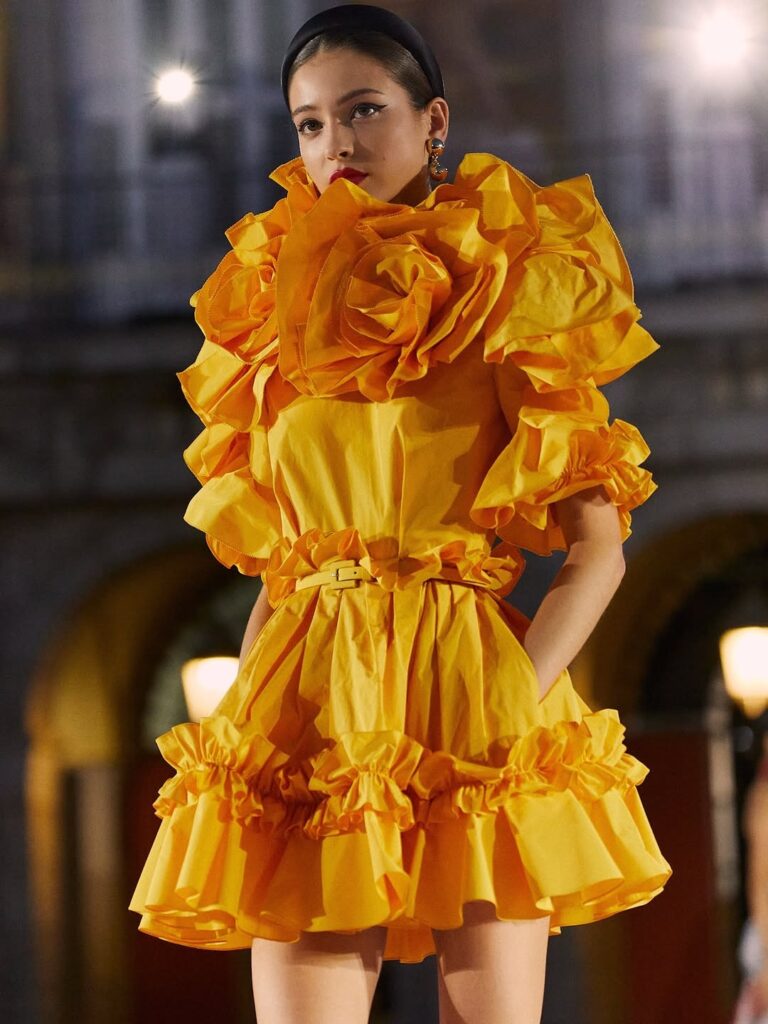 The collection drew deeply from cultural resonance, weaving references to Spanish heritage into garments that feel both familiar and daringly new. Dresses flowed with a disciplined grace, while volumes and pleats hinted at celebration, ceremonial gestures, and a quiet grandeur that demands attention without shouting. Color and texture were not accents but narrators: vibrant reds and warm neutrals evoked passion tempered by elegance, while the careful layering of fabrics created a tactile lyricism that invited closer observation.