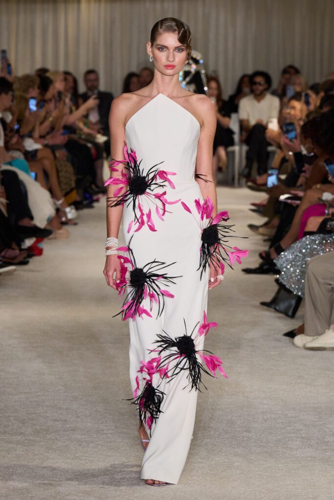 The runway opened in a dialogue of black and white, the monochromatic palette establishing a visual clarity that allowed structure and silhouette to speak. Crisp tuxedo jackets, sharply tailored suits, and sculpted gowns juxtaposed curves and angles, strength and sensuality, while subtle detailing hinted at Siriano’s signature meticulous craftsmanship. As the show progressed, vibrant hues and bold prints emerged — polka dots, stripes, and graphic motifs animating the stage and creating a sense of playful dynamism.