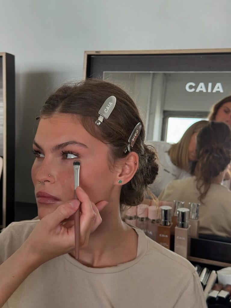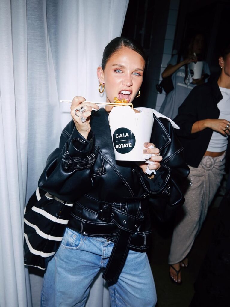 The brand’s partnership with Caia Cosmetics during the event felt less like a marketing move and more like a shared manifesto. Both labels trade in the currency of self-expression, and their backstage collaboration created a sensory parallel to the garments: lips lacquered in unapologetic reds, skin illuminated with the soft precision of northern light. Caia’s presence enhanced the storytelling, infusing the Rotate woman with a beauty narrative that matched her wardrobe — confident, luminous, and unafraid to claim space.