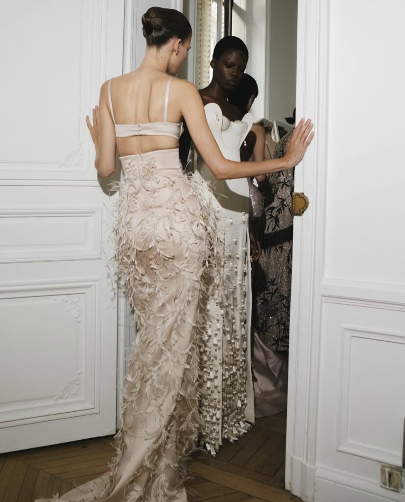 In the pale morning light filtering through the grand windows of the hôtel particulier, the space felt almost like a private atelier. Dresses stood poised on mannequins like silent witnesses, awaiting the moment they would transform into living sculpture. Garment bags were gently unzipped, not with haste, but with reverence. Assistants moved with quiet precision, their hands trained not only in skill, but in care.