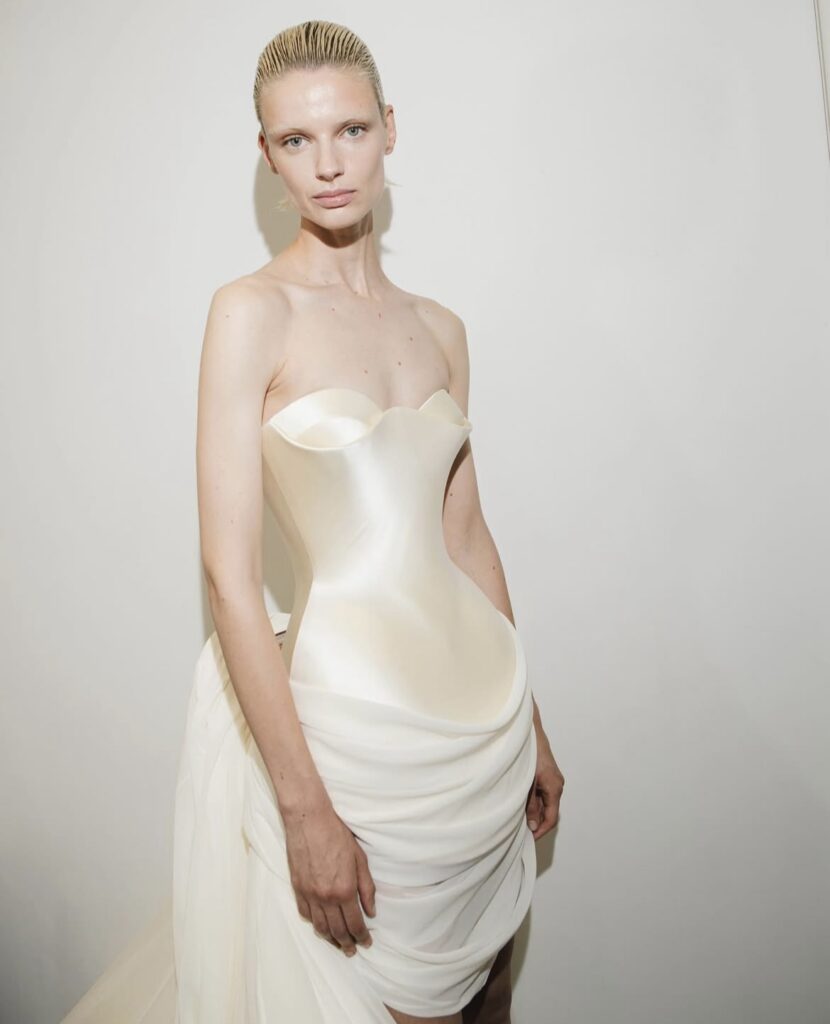 Ashi’s team worked in near silence adjusting pleats by millimeter, aligning sculptural folds that curved like modern armor and softened into weightless halos. The textures were celestial: structured silks that held their breath, tulle like frozen smoke, satin molded into impossible geometry. Embroidery shimmered like constellations, stitched not merely for ornament but as language.