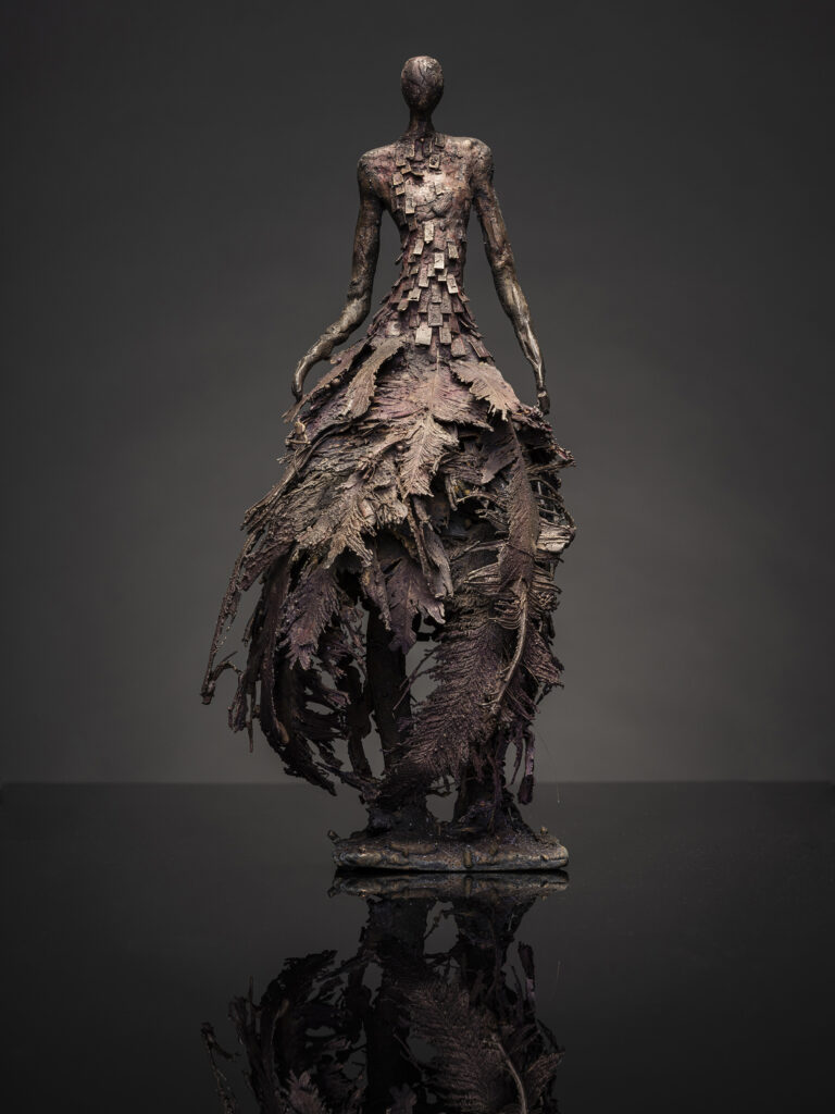 RN – The silhouettes of couture often become the armature of my imagination — defined torsos, dramatic skirts, or exaggerated shoulders find echoes in my bronzes. But it’s the detailing — the small embellishments, the surface treatments — that feel closest. Just as couture artisans layer, stitch, and bead, I layer textures from nature, building complexity into each piece.